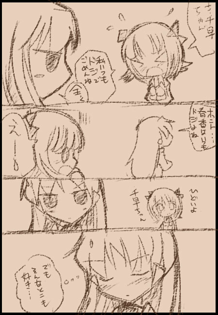 でも百合って・・・。私的には「はるちは」も「やよいおり」も微笑ましい友情なんですよね。 彼女らには、恋愛ではなく、あくまでしんゆうであって欲しいです。 誰よりも親しく、誰よりも信じられ、誰よりも心を許せる友だと良いなと。 >『ちはる』 別の作者かも知れませんが、私もそういう本持ってます。 ただ、私の読んだ本は、自分の感情を素直にだしきれてない(伊織みたいな)、はるちは一歩手前って感じを受けました。 私の脳内では、「ちはる」は結局「はるちは」になって、千早は春香に勝てないのです。 >と、まあ分かる人にしか分からない事なんでしょうけど…。 感性の低い、分からない奴ですみません。