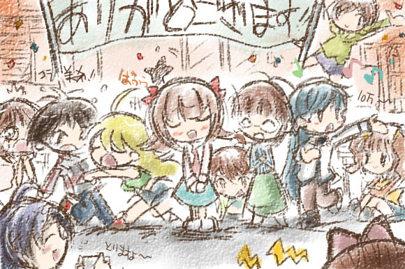 なんてありがたい事でしょう…。 これも足を運んでくれる皆様、またコメントくれる方々。 そして自分の記事を紹介してくださる方々のおかげです! どうもありがとうございます!! というわけで2万くらいから止まってたのですがw 流石に何も描かないのもアレなので皆様への感謝のイラストでも 後ろで手を振ってるのは社長という事でw そして撮影に遅れた伊織の将来がとても楽しみです! でこのブログを振り返ってみると… 4コマ描いたり、アイマス情報系になってみたり、 バニーだったり、百合だったり、製作状況報告だったり。 もう何のブログか分かりません!! というわけで今後もアイマスファン1のカオスブログを目指しますw よろしければお付き合いください。 【追記】 ギーゴのアイマスノート時代の盟友タナーPにリンクを貼らせてもらいました! いいんだろうか…。もし迷惑なら言って下さいw ゲーセンでコメのやりとりはあったのですがネット上では最近。 一緒のノートに描いた人と巡り合うとは…人生は不思議ですw 千早オンリーに向けてがんばってるようですが、 同じ場所で培ってきた者同士がんばりましょうね!! あとアイマスの名古屋地下鉄車内広告らしいのですが…↓ いったい!どこで間違えたんだ!! … 本当に…私たちはどこで道を間違えたんでしょうね…(遠い目) |