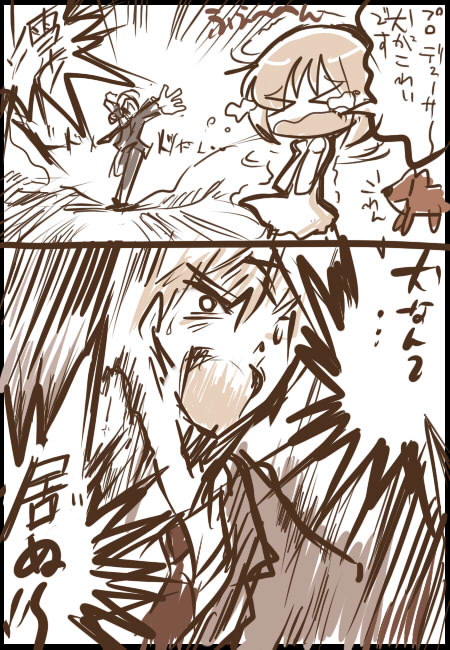 「タカシP…。また急に何を言い出すんだ…。」 と思ったそこのあなた。いやー勢いは重要ですよ。 最近…なんでしょうおとなしめで意外性が自分には無いかと。 要はノリです。ちょっとはじけてもいいのでは? これが重要なんです! 動画の進行状況も思わしくないのは『勢い』成分の低さ。 作ってても『間』を重要視してしまうので… こう『ノリ』と『勢い』でガーツ!!と作る事が無いんですよねー。 人様の動画を見てもそういう瞬間の熱さが自分には欠落気味かと。 難しいですよね…勢い、熱さ。 そこで! タカシPはこれから勢い良く行こうかと!! ただいきなり勢いをつけるのも性急な事なので…。 ちょっとこう自分の考える勢いというのを図式で表してみようかと。 果たして皆さんに勢いを感じてもらえるか… がんばってみたいと思います…。 【タカシPの考える勢い①】 「!」 「・・・」 「…プ、プロデューサー!!」 やば!勢いあまってPやっちゃったよ!! うーん…勢い…。 本当に勢いというのは難しい物ですよね…。タカシPには早そうです。 というわけで反省を生かして2回戦目もがんばろうかと…。 もしよろしければ続きからどうぞ…。↓ PR