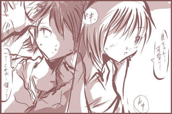 例えば同じ魚を釣っても生で食べるところ、煮込んで食べるところ、干すとこ・・・。 などなど。 同じ人間でも違い、また影響し合うというのが大変面白いですね。 サラディーンと戦った西の十字軍の人達が 「イスラムマジやばいww」 と感動して騎士道精神を作っちゃったり。 ご先祖様の悲願とばかりにペルシャに遠征に行ったアレクサンドロス大王が すっかりペルシャかぶれになってしまったりと。 こういう東西融合じゃないですけど個々の相違が違う文化を生み出す。 興味深いですよね・・・。 というわけで一つのお題から相互文化を生み出す『アイマスまんが道場』 例えば赤い人のちょっかいから↓ www.geocities.jp/redfrogsplash/center.html りよ。さんが下記の文章で返答を記し↓ 「えへへ~、ボクもピンつけてみたんだけど、どうかな~」←元 「ここはもっとこうしてこうした方が可愛くなるの」 「わわ、美希何するんだ、あ…」 「ま……まことちゃん、かわいい(どきどき)」 「こ…これがぼく(どきどき)」 ★7さんがそれを絵におこすと↓ sevenstar7777777.blog118.fc2.com/blog-entry-215.html 扱ってるお題が同じでも個々のパーソナリティが出て非常に面白いです。 で、自分の場合↓ とこうなります。 つまりタカシPの文化では ①基本は押し倒される真 ②何故か脱がされ気味な衣装 ③つーかあなた達誰? これが基本となっております。 この文化を基にしながら今まで動画を作ってたり・・・漫画を描いたり・・・。 またここから新たな文化が生まれる可能性もあるわけです。 『アイマスまんが劇場』と名をうちながら 人類の壮大な歴史を極めてミクロ的な視点で実験を行う。 そういった試みも必要なのではないでしょうか? 結論: ニコマスは文化 文化涙目www 前回の記事でアンケートをとったところ |