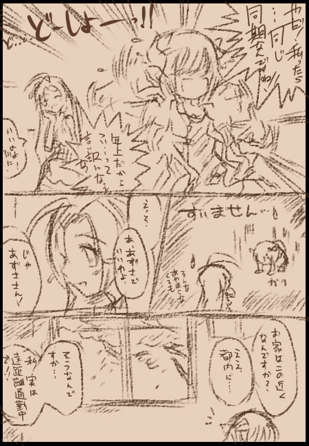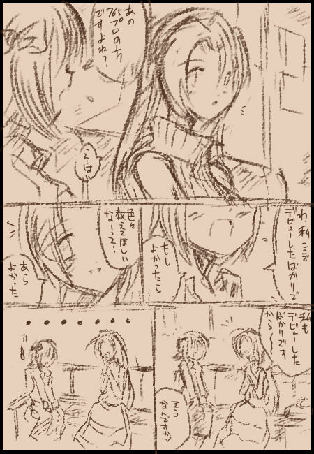 反省点:「ネームが多い」 自分は字が汚いのでネームをなるべく減らそうと努力してきましたが、 今回は雰囲気的に多目。でもうるさいなw あとあずささんの内面と言ったのにもかかわらずお話的にあまり踏み込めなかったかな・・・。 というわけで反省を生かし今後も精進したいと思います。 漫画は続きから。