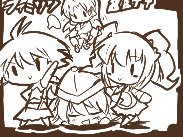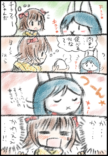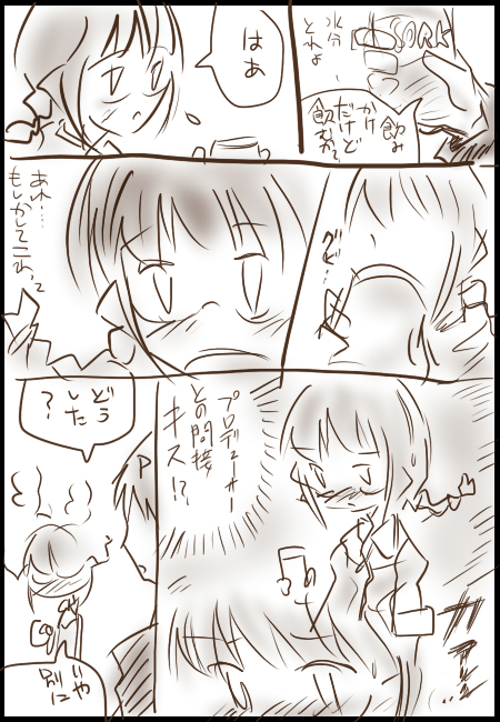 「キスマスにでるっきゃ騎士(ナイト)☆」 という素晴らしい格言を残していかれたので自分も熟考してみました。 *直接的なキスは恥ずかしい→ならばキスシーンを描かずに表現。 *キャラ、律子→状況、Pと二人でダンスレッスンの休憩中。 以上の事を踏まえてタカシP版キスマスの 思考実験漫画です。 ↓ これだな ・・・向こうはその気がないのにPのことを意識してしまう律子。 表面上は何事も無くふるまっても、 心の奥では動揺を隠せない。 「うれしい・・・うれしいけど・・・ あの人はいつもどうりに私に対してふるまってるだけなんだ。」 葛藤と喜び。 思い出と切なさ。 キスシーンがなくてもキスから生まれるドラマ!これぞキスマス(裏)。 この律子の淡い思いを・・・いざ動画に!!! と思ったけどキスシーンがないから却下対象なんでチッフィーちゃんに戻りま~す。 |