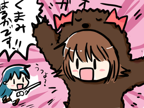 かみたPさんのやよねこ 前にwaitモードを目指してたという事でそれ風に挑戦してみましたができませんでした。 でもやよねこ可愛くて描きやすいです。 そして最近の衝撃的な出会い まるで道端で熊にばったり出会わしたような衝撃を受けました。 そりゃあ熊ですもんね。 OGOPさんの動画から辿っていってのですがこの発想。 たぶん自分には逆立ちしても出せません。 正直酸欠状態になりながら動画を見てたのですが… ここまで名で体を表せるPさんもあまりいないのでは? まさか熊に萌える日が来るとは 影響を受け描いた絵がこれか という風にニコマスから自分は色々な物を得て… 許可なく3次創作(?)とかどうなのかなーと思ってますがうざいんだったら言って下さい。すいません。 でも他の人達の作品が楽しくてホント自分の動画どころじゃな… じゃいけないな。